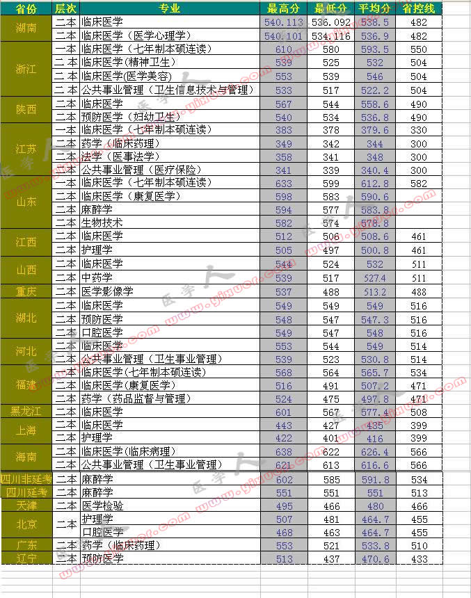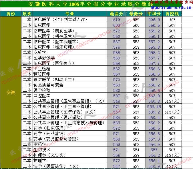 [组图]安徽医科大学2008年分省分专业录取分数线