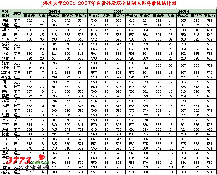[图文]深圳大学2005-2007在各省本科录取分数线