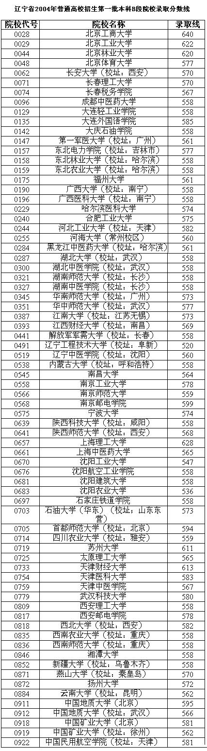 东北新闻网讯 (记者 金璐) 为保证我省普通高校招生录取工作在公正、公平、公开的良好环境下顺利进行,本着为广大考生和社会服务的原则,进一步增强招生录取工作的透明度,省招考委决定,在每批次招生院校录取结束后向社会公布各招生院校录取分数线。现将《辽宁省2004年普通高校招生第一批本科B段院校录取分数线》予以公布,并说明如下:
