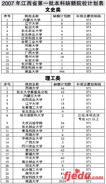 本报南昌讯特派记者黄小路报道:13日,省高招办在对一本二志愿二次投档后,仍有39所院校缺额计划4189名。7月14日8时~18时,凡是文科573分、理科571分的一本线上考生均可补报一本缺额院校志愿。