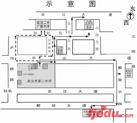 五、武汉二中校园平面图: 六、交通信息 至武汉二中的公交线路: 1、二中周边车站: 汉口芦沟桥路站:30路、212路、520路、548路、721路、707路、727路、588路、601路、526路、402路 汉口永清街站:电车2路、电车3路、606路、201路、543路、712路、508路、807路、719路、549路、532路、605路、805路、729路、724路、719路、548路、212路、606路、622路、707路、581路、60路 2、轻轨:乘轻轨到黄浦路站即可。 3、汉口火车站出站:509至永清街下,下车后问轻轨黄浦路车站即到武汉二中 4、汉口新华路长途汽车站:出站后过马路,坐3路电车、712、508、黄色巴士至永清街下,下车后问轻轨黄浦路车站即到武汉二中 5、武昌南站出站:805至永清街、577、717至头道街下然后向后转乘至永清街的车 6、汉阳(王家湾):乘707、520至芦沟桥路下 7、汉阳(琴台):乘727至芦沟桥路下 8、天河机场:可乘机场大巴至航空路转至解放大道乘712、508、黄色巴士至永清街,也可坐出租车由机场大道-发展大道-黄浦大道至二中(出租车全程车费约60元左右)。 七、食宿信息 (一)进餐 1、学校食堂订餐电话:027—82711636 地址:二中校内 备有盒饭:每份8元 三种类型套餐任选 ①号套餐:脊骨焖藕 肉末豆腐 腊肉菜苔 卤蛋 米酒甜汤 ②号套餐:花菜烧肉 干子榨菜肉丝 菠菜 鸡腿 蕃茄蛋汤 ③号套餐:干锅鸡块(配土豆) 千张小白菜肉丝 藕丁 盐蛋 虾米冬瓜汤 2、二中品道餐厅订餐电话:027—82711815 地址:中山大道和郝梦龄路交叉路口,从二中中山大道门出门向右直行 备有套餐如下: 咖啡鸡饭8元 肉末豆腐饭6元 黑椒牛扒(鸡扒)13元 备有各色小炒,欢迎预订 3、考生及家长进餐可到二中品道餐厅或二中食堂,汇申酒店、滨江饭店都不提供午餐和晚餐。学生报到时,可在二中接待处订餐。 (二)住宿 1、滨江饭店订房电话:027-68825688 与饭店协商,对考生住宿收费标准:双人标准间150元/天(含早餐) 地址:山海关路1号,从二中中山大道出门向右后,直行约 2、艳阳天时尚旅店 店堂电话:027-82222777 027—82222999 经二中与饭店协商,对考生收费标准:双人标准间140元/天、175元/天二种价位 从中山大道门出门向右转,到中山大道直行 3、汇申大酒店 大堂电话:027-68826666 经二中与饭店协商,对考生收费标准:双人标准间268元/天,单人间210元/天 地址:武汉汉口沿江大道234号 从中山大道门出门向右转约 4、7天解放公园商务旅店 大堂电话:027-82611788 经二中和旅店协调,对考生收费标准:单人间129-149元/天,双人间159元/天 八、送考家长休息室(兼茶水供应处): 学术厅、学生超市(校内学生公寓1楼)、音乐教室一、音乐教室二、六楼报告厅、桂花林休憩区(从卢沟桥路门进校右边科技楼旁)。武汉大学送考家长休息室设在广雅中学食堂。 | |||||||||||||