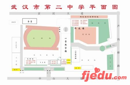 至武汉二中的公交线路: 1、二中周边车站: 汉口芦沟桥路站:30路、212路、520路、548路、721路、707路、727路、588路、601路、526路、402路 汉口永清街站:电车2路、电车3路、606路、201路、543路、712路、508路、807路、719路、549路、532路、605路、805路、729路、724路、719路、548路、212路、606路、622路、707路、581路、60路 2、轻轨:乘轻轨到黄浦路站即可。 3、汉口火车站出站:509至永清街下,下车后问轻轨黄浦路车站即到武汉二中 4、汉口新华路长途汽车站:出站后过马路,坐3路电车、712、508、黄色巴士至永清街下,下车后问轻轨黄浦路车站即到武汉二中 5、武昌南站出站:805至永清街、577、717至头道街下然后向后转乘至永清街的车 6、汉阳(王家湾):乘707、520至芦沟桥路下 7、汉阳(琴台):乘727至芦沟桥路下 8、天河机场:可乘机场大巴至航空路转至解放大道乘712、508、黄色巴士至永清街,也可坐出租车由机场大道-发展大道-黄浦大道至二中(出租车全程车费约60元左右)。 七、食宿信息 (一)进餐 1、学校食堂订餐电话:027—82711636 地址:二中校内 备有盒饭:每份8元 三种类型套餐任选 ①号套餐:脊骨焖藕 肉末豆腐 腊肉菜苔 卤蛋 米酒甜汤 ②号套餐:花菜烧肉 干子榨菜肉丝 菠菜 鸡腿 蕃茄蛋汤 ③号套餐:干锅鸡块(配土豆) 千张小白菜肉丝 藕丁 盐蛋 虾米冬瓜汤 2、二中品道餐厅订餐电话:027—82711815 地址:中山大道和郝梦龄路交叉路口,从二中中山大道门出门向右直行 备有套餐如下: 咖啡鸡饭8元 肉末豆腐饭6元 黑椒牛扒(鸡扒)13元 备有各色小炒,欢迎预订 3、考生及家长进餐可到二中品道餐厅或二中食堂,汇申酒店、滨江饭店都不提供午餐和晚餐。学生报到时,可在二中接待处订餐。 (二)住宿 1、滨江饭店订房电话:027-68825688 与饭店协商,对考生住宿收费标准:双人标准间150元/天(含早餐) 地址:山海关路1号,从二中中山大道出门向右后,直行约 2、艳阳天时尚旅店 店堂电话:027-82222777 027—82222999 经二中与饭店协商,对考生收费标准:双人标准间140元/天、175元/天二种价位 从中山大道门出门向右转,到中山大道直行 3、汇申大酒店 大堂电话:027-68826666 经二中与饭店协商,对考生收费标准:双人标准间268元/天,单人间210元/天 地址:武汉汉口沿江大道234号 从中山大道门出门向右转约 4、7天解放公园商务旅店 大堂电话:027-82611788 经二中和旅店协调,对考生收费标准:单人间129-149元/天,双人间159元/天 地址:见示意图。 八、送考家长休息室(兼茶水供应处): 学术厅、学生超市(校内学生公寓1楼)、音乐教室一、音乐教室二、六楼报告厅、桂花林休憩区(从卢沟桥路门进校右边科技楼旁)。武汉大学送考家长休息室设在广雅中学食堂。 | ||||||||||||||