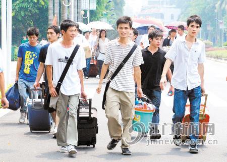 新生们提着大箱小包走进校园,他们对即将到来的的大学生活充满了期待。见习记者 杨兆宇 摄 本报讯 昨日,五邑大学迎来了3462名新生,来自山西、内蒙古、甘肃等西部省份的新生以及20名少数民族新生成为新学期开学的亮点。据悉,该校今年新生第一志愿录取率超过90%,创历史新高。 昨天上午10时左右,在五邑大学新生报到处,记者看到前来报名的新生络绎不绝,不少新生在师兄、师姐的引领下按部就班办理各种入学手续。“很方便,一进校门就有师兄、师姐主动迎接,帮我们拿行李,领着我们办各种手续。”信息学院电子信息工程新生冯建生说。 五邑大学副校长卓雄告诉记者,今年该校一年级新生共有3462人,其中外省学生345人。该校今年扩大了生源地,招生扩大到14个省份,为响应教育部号召,支援西部高等教育,今年首次在山西、内蒙古、甘肃等西部省份招生。此外,该校今年招收的少数名族学生达20名,有布依族、蒙古族、回族等7个少数民族的新生,这在五邑大学历史上也是很少见的。 学校对家庭暂时贫困的新生还开设了“绿色通道”,采取“先入学,再缴费”的原则,保证新生不因贫困而上不了学。来自湖北通山的新生汪顾宗告诉记者,他父母离异,父亲在当地从事教育工作,每月工资1000多元,巧合的是今年他弟弟也考入五邑大学,如果不通过“绿色通道”,他们很难顺利上大学。“家庭条件本来不好,加上兄弟两人同时上学,如果没有‘绿色通道’,学费是个大问题。”汪顾宗说。据介绍,昨天共有约200名新生申报了“绿色通道”。 (见习记者 李于伯 通讯员 蔡灼暖) |