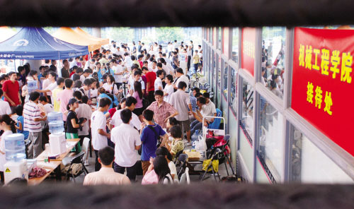 昨日,东莞理工学院3000多名大一学生开始入学。图为记者透过栏杆拍摄的报到现场。