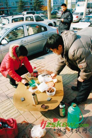 由于吃中午饭时间紧迫,父母为孩子在校门口摆“餐桌”。记者 郑涛 摄