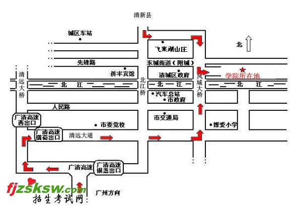 请按箭头所示最佳路线行驶,留意沿途学院指示牌。