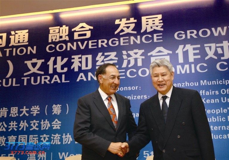 昨天下午,市人民大会堂,中美(温州)文化和经济合作对话会现场,美国肯恩大学校长达伍德·法拉希先生与温州肯恩大学(筹)校长陆善镇教授握手,共话温州肯恩大学(筹)的未来发展。本报记者 郑之越/摄