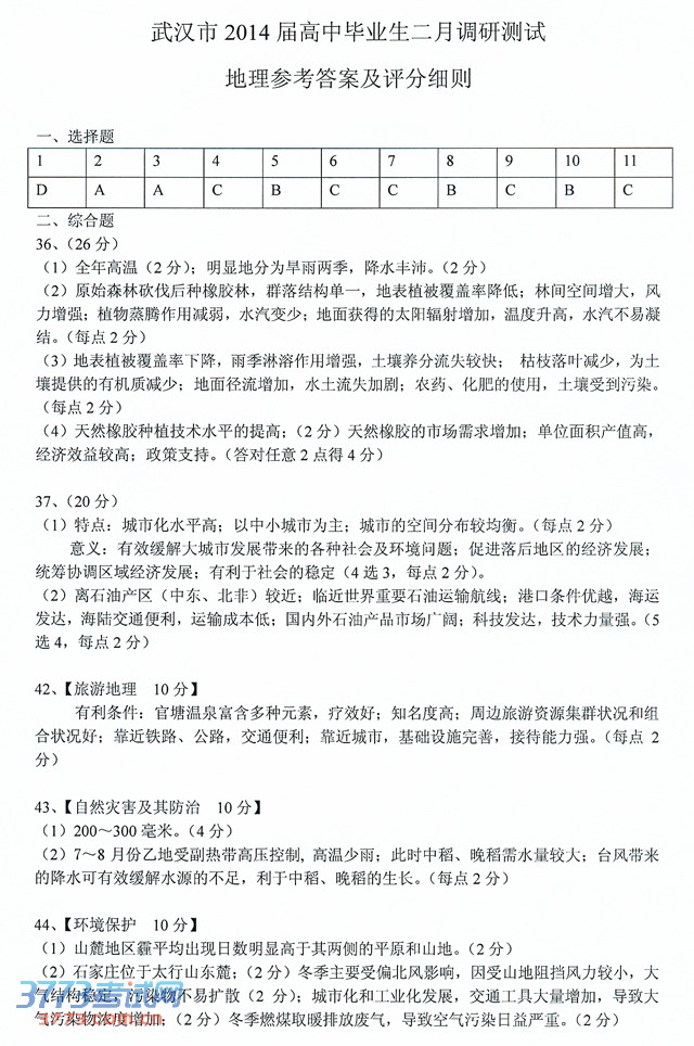 [图文]2014武汉二月调考试题地理答案及评分标准
