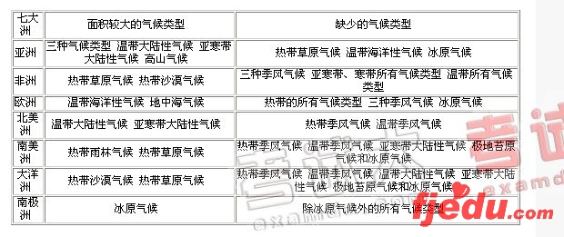 9、各大洲中分布面积较大的气候类型及缺少的气候类型:(见下表)