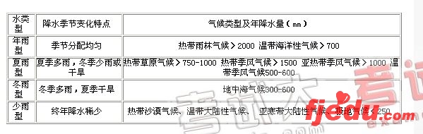 B、从降水上看,可以将世界气候类型归纳为以下四种:(见下表)