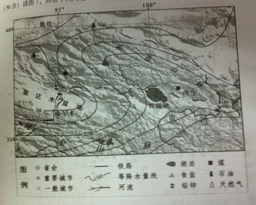 (1)题是考查描述题中降水分布的描述考查,与2011年北京高考地理题类型。答降水分布特征首先要答一个降水总体情况,然后再答降水分布情况,这是我们讲课重点要求的内容。很明显,得出降水从东南向西北递减的特征,总量在50—500之间,我们要求答分布一定要答出一个大体的规律来。柴达木盆地深居内陆,距海较远,水汽难以到达,并且四周有高大山脉阻挡,阻挡了水汽的到达。
