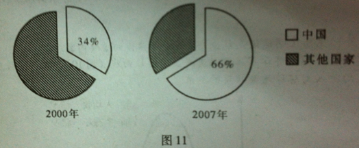 材料一 中国和澳大利亚是世界上主要的羊毛生产国和贸易国。中国目前已成为世界上最大的羊毛加工中心,年羊毛加工能力超过40万吨净毛,而自产量仅为10万吨左右。据统计,2006年澳大利亚羊只数量为1亿头,主要为优质的美丽努细羊毛。图11表示澳大利亚羊毛出口量的比重。