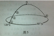 图5为部分经纬线图,30°N纬线与120°E经线相交于①地,①、②、③、④地位于同一经线圈上,且①与②、②与③之间维度差均为15°,N为北极点。读图回答10、11题。