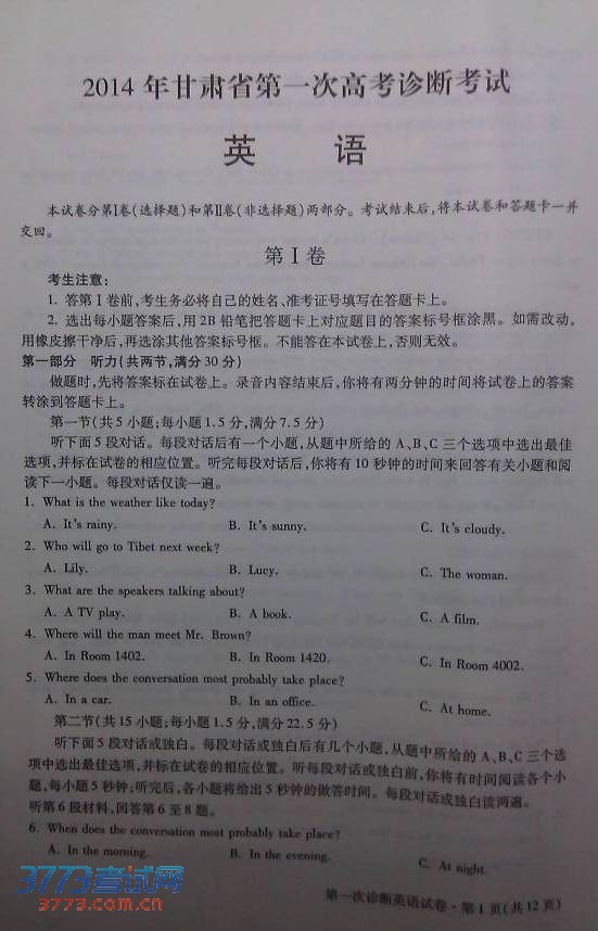 甘肃省2014届高三第一次高考诊断(一模)考试英语试题(清晰扫描版)2014甘肃一诊英语试题答案发布