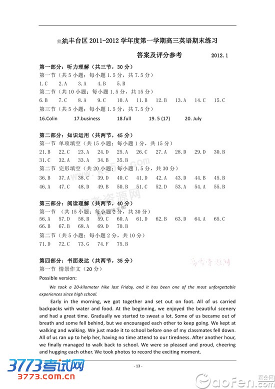 [组图]2013北京丰台高三英语期末试题答案
