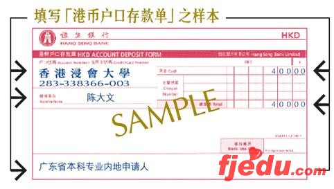 4. 直接前往香港恒生银行缴付港币400元申请费。香港恒生银行之“港币户口存款单”(HKD Account Deposit Form)各项资料须填写如下: