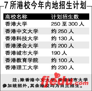 昨天,记者从招生部门了解到,目前已有7所香港高校确定2008年面向内地的招生计划。目前,香港大学、香港理工大学、香港城市大学申请工作已经启动,从往年情况来看,这些学校对英语要求比较高,考生报考时要早做准备。