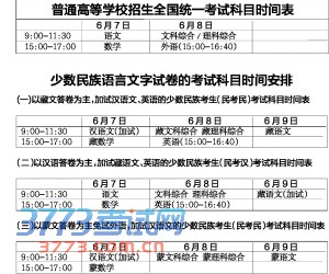 同时,省招办也公布了少数民族语言文字试卷的考试科目、时间安排。少数民族语言文字试卷的考试科目分为三类:以藏文答卷为主,加试汉语文、英语;以汉语答卷为主,加试藏语文、英语;以蒙文答卷为主免试外语,加试汉语文。此类考试的时间为6月7日至9日。