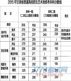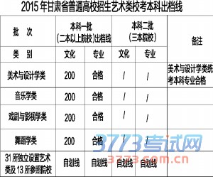 同时,省招办也公布了2015年甘肃省普通高校招生艺术类校考本科出档线,使用校考成绩的院校(不含独立设置本科艺术类院校),文化课成绩须达到我省相应类别和批次文化出档线,并且校考专业合格基础上,按学校公布的招生章程再确定分数线。