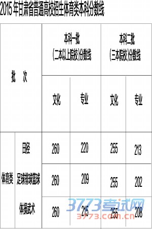 每日甘肃网-兰州晨报讯(记者魏娟)7月3日,省招办公布了2015年甘肃省普通高校招生体育类本科分数线、艺术类统考本科分数线。艺术类各类别的本科文化课控制线均比去年降低了10—30分,专业课略有变化。考生需要注意的是,与普通文理类不同,体育、艺术类本科一批指二本以上院校,二批指三本院校。