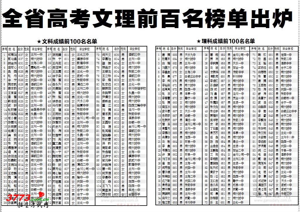 [图文]2012甘肃省高考文理前百名榜单出炉