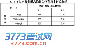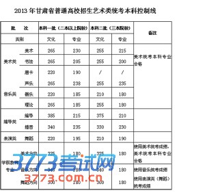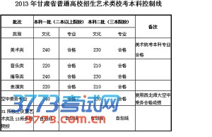 中国甘肃网7月5日讯 据西部商报报道 (首席记者 郭涛)昨日,省招生办公布了2013年我省普通高校招生艺术类统考本科控制线、艺术类校考本科控制线以及体育类本科控制线。