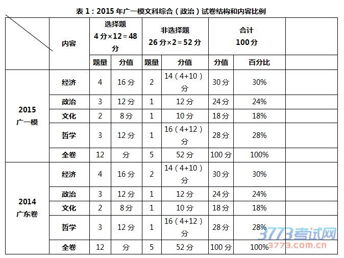 表1:2015年广一模文科综合(政治)试卷结构和内容比例