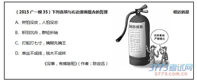这次的漫画有标题,叫《没事,有措施呢》。图中有两个主人公,一位一手拿着一根烟,一手指着灭火器说话;另外一位则指出:仓库重地,严禁烟火。通过观察漫画,我们应该能理解这幅画的内涵,无非讲的就是:严禁烟火才是做好消防的关键,而不是文字版的消防措施,引申出来的哲理就是解决问题要抓住主要矛盾。通过对比选项,我们不难发现,讲主要矛盾的就是C,故选出正确答案。像这类特殊的题型,在我们的课堂上会有分类练习与方法讲解,通过训练,大家一定不会再怕哲学漫画题。
