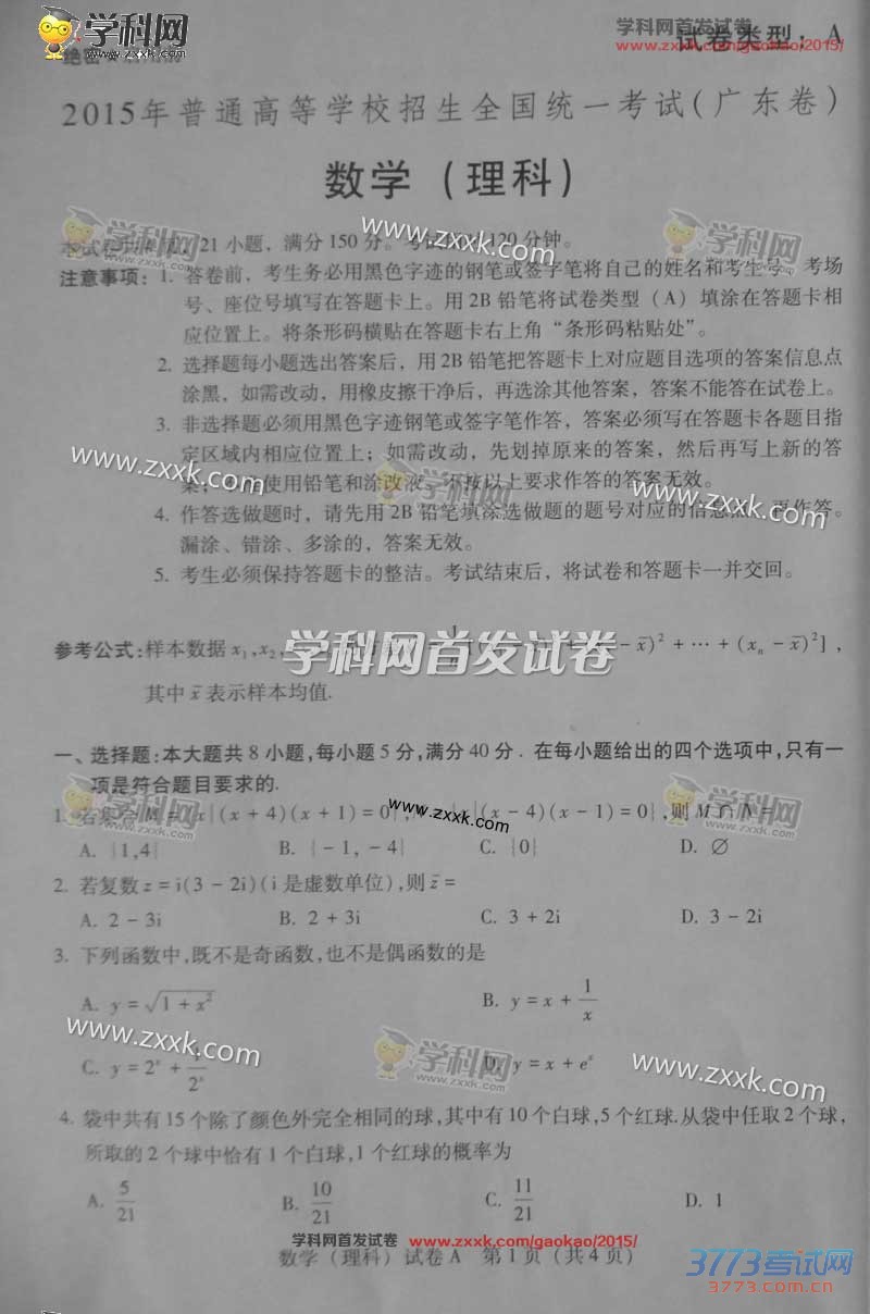 [组图]2015广东高考数学理科试题发布