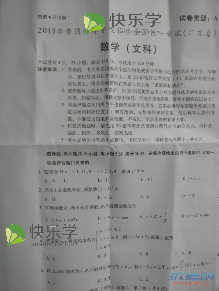 [组图]2015广东高考数学文科试题试卷