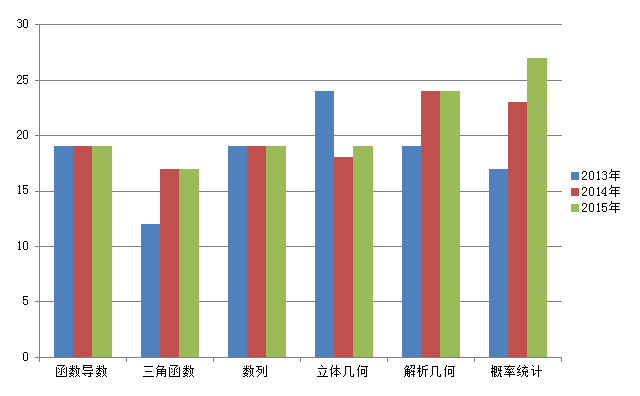 从总体来看,试卷结构(8+8+6)并没有变化,但最后三题知识点分布和以往不同。试卷的整体难度比2014年稍有下降。选择填空题(1-15题)的考查点均以基础题为主,中档题的比例稍有降低,创新类题目难度降低。解答题的前3题(16-18题),难度基本保持一致。至于后3题(19-21题),改变了以往数列、解析几何、导数的排列顺序,大胆创新,除了压轴最后一题难度较高外,普遍难度降低,2015年高考对基础扎实的学生尤其有利。