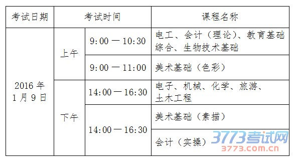 2016年上半年专业技能课程考试开考课程为:《电工》、《电子》、《机械》、《化学》、《会计》、《旅游》、《美术基础》、《教育基础综合》、《音乐综合》、《土木工程》、《生物技术基础》和《体育》,共十二门课程;其中《音乐综合》、《美术基础》和《体育》不考理论,只考操作技能。《土木工程》只考理论,不考操作技能。