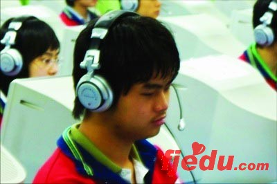 口语考试为“人机对话”,考生面前没有考官,没有问答人员,有的只是一台台冰冷的电脑,考生所有的对答通过戴在头上的耳机麦克风来完成。