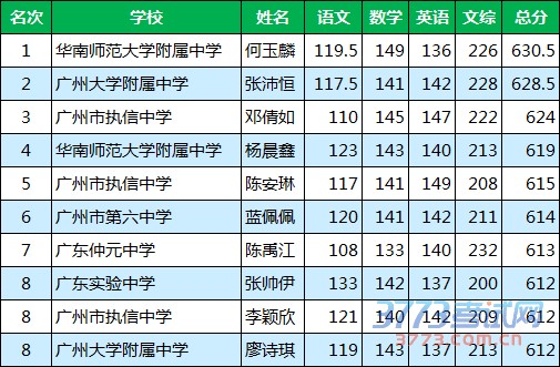 文科前十中,全市第一名来自华师附中,总分630.5分,第二名来自广大附中;前十名中执信占了3名,华师附中和广大附中均占了2名。详见下表: