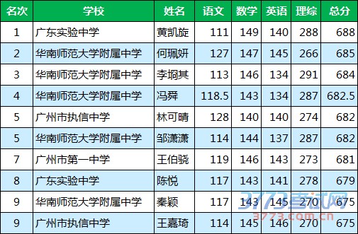 理科第一名来自省实,688分。理科前十中,华附占据5名,优势明显;省实、执信分别占据两名;最后一个位置由广州一中占据。广雅、二中、六中均无人进入前十。