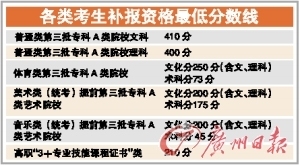 有关部门表示,凡总分在省招生办公室公布的补报志愿最低资格分数线以上(注:资格分数线仅是补报志愿的资格,不是录取的最低控制分数线),未被高等院校录取的考生均有资格参加第三批专科A类院校的补报志愿。有关高校未完成招生计划情况及补报志愿要求,考生可登录网站(www.eeagd.edu.cn)或到各市、县(区)招生查询。凡已被高等院校录取的考生不能补报志愿。未完成招生计划的学校补报志愿的资格要求不同。考生在补报志愿时需根据自己的成绩,按公布的学校补报分数要求进行补报。(各类考生补报资格最低分数线见表)