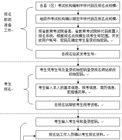 第一条 普通高等学校招生统一考试采取互联网报名方式。报名前各级考试机构要预先做好中学代码、报名点代码、报名点规模的审定确认工作。报名时,考生凭报名点或中学派发的考生号、初始密码登录报考网站后修改密码,通过互联网了解报考须知,签订《考生诚信考试承诺书》,在网上自行录入本人的基本信息,然后在省教育考试院规定的确认报名资格时间内到市、县(区)招生办公室(考试中心)指定的报名点确认报名资格、校对报考信息、电子摄像、交纳报考费和打印报名校对表。