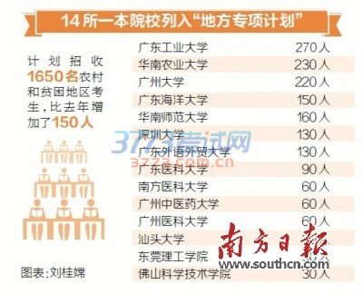 据统计,广东14所第一批本科院校列入“地方专项计划”,计划招收1650名农村和贫困地区考生,比去年增加了150人。