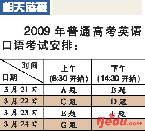 根据今年我省报考普通高考英语口语考试的考生人数情况,2009年普通高考英语口语考试时间安排在6个时间段进行(详见下表),3月24日为处理异常情况考试。各市、县(区)可根据当地考生报考人数合理安排考试时间。