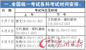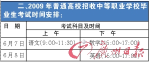 本报讯(记者秦晖通讯员廖翊华)记者昨日从广东省教育考试院获悉,广东省2009年普通高等学校招生全国统一考试时间安排已经确定。考试时间仍然为6月7、8、9三日,除语文外,其余科目考试时间均为两个小时(详细日期见附表)。 (来源:广州日报)