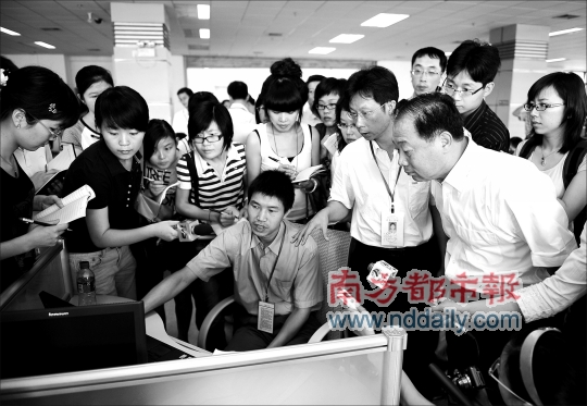 昨日,广东省副省长宋海(前右)来到华南师大大学城校区视察高考评卷现场。 本报记者 方谦华 摄