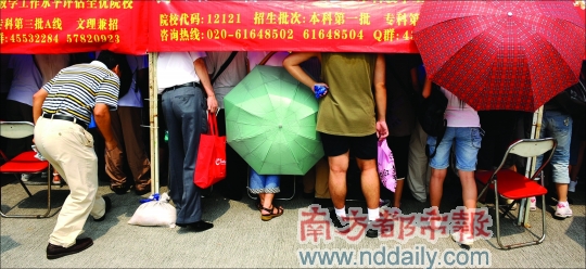 昨日,2009年广州高考咨询会在广州大学城广场举行。恰逢夏至日,大学城树木尚未成阴,家长们头顶烈日热情不减。咨询会预定上午10点开始,但8点半就有家长和考生进场,大都扶老携幼组团前来。一位家长说,他们全家老少一共来了9人,最小的还在上幼儿园,“先让他们感受一下大学的氛围”。本报记者 方谦华 刘黎霞 摄影报道