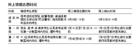 具体填报志愿的时间分为提前段(6月29日-30日)、第一时段(6月30至7月3日)、第二时段(7月4日至7日)。考生须根据具体的填报志愿时间,在规定时段在网上系统填报报考的院校和专业,此外还要记得在规定时间内完成志愿表打印及校对签名确认。