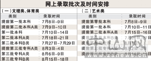 中山网讯 昨日,广东省考试院下发 《关于做好广东省2009年普通高等学校招生网上录取工作的通知》,公布了志愿填报后网上录取批次及时间安排。同时,教育部《2009年普通高等学校招生工作规定》指出,对超过时间不按要求完成相关环节工作的高等学校,广东省招生办将根据发出的考生电子档案,按高等学校计划数1:1.0 的比例从高分到低分顺序设置考生电子档案为预录取状态,多余的考生电子档案由省招生办收回。