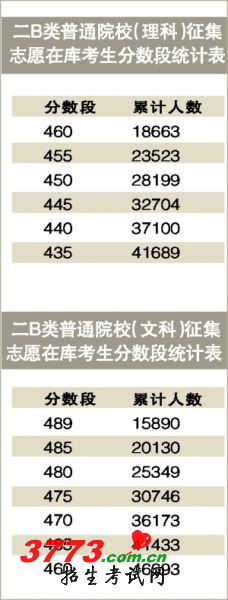 省教育考试院负责人提醒考生,由于今年二B院校在第一次录取时较好地完成了招生计划,与往年相比,今年征集志愿的计划有所减少,文、理科计划各仅剩6000人左右,而未被录取的征集志愿资格线以上的人数较多,其中理科440分以上就有3.7万人,文科465分以上有4.1万人。因此,考生填报征集志愿时,仍要合理填报,形成梯度,以提高录取机会。