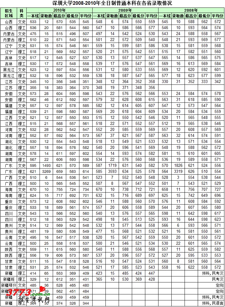 深圳大学208-2010在各省本科录取分数线