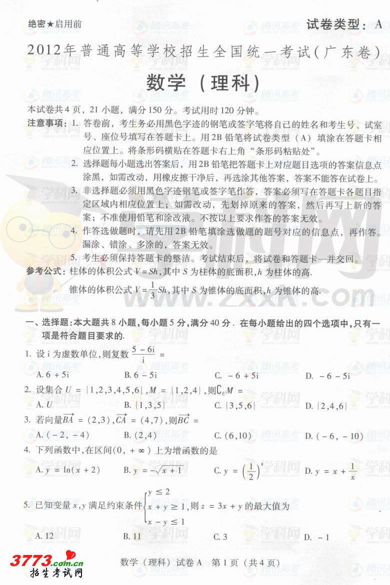 [组图]2012年广东高考理科数学A卷试题答案