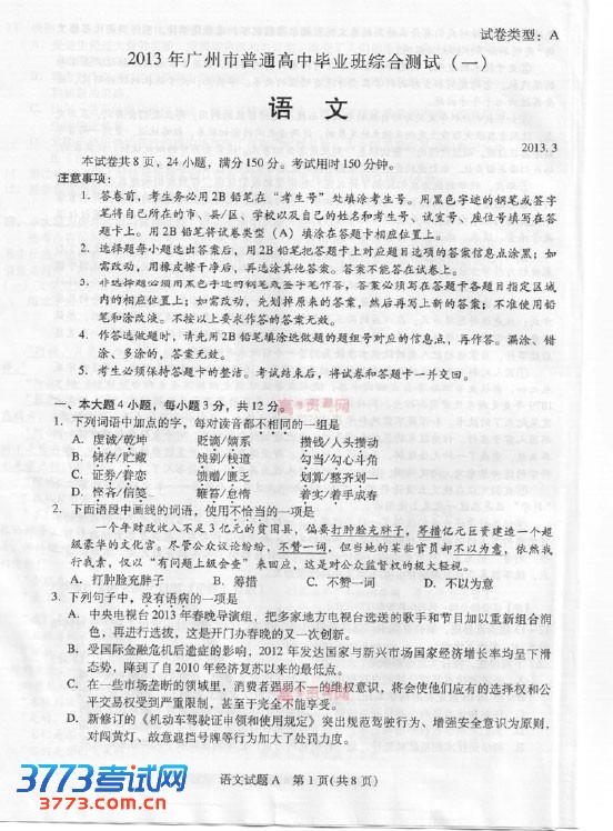 2013广州一模考试已经结束,2013年广州一模考试主要考察考生对知识点的掌握程度,也是对2013年高考的一次重要演练。请广大考生引起重视。本套试卷也适合其他省市考生借鉴!