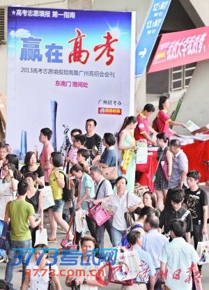 广州市2013年普通高等学校招生现场咨询会昨天举行。包括了本专科院校、高级技工类院校以及教育培训、留学机构的380多家单位设置了759个展位,总展位比去年增加了近150个,招生办形容为“盛况空前”。据不完全统计,包括珠三角地区的8万多考生、家长进场咨询。记者看到,二A名校“生意”最好,咨询者火爆,这也折射今年二A竞争激烈的态势。