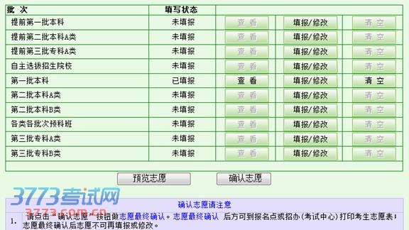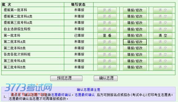 如果发现志愿有误,则点击相应批次的“填报/修改”按钮来修改相应的错误信息。如果要清除掉该批次的志愿,则点击相应批次的“清空”按钮,将清空掉该批次的志愿。